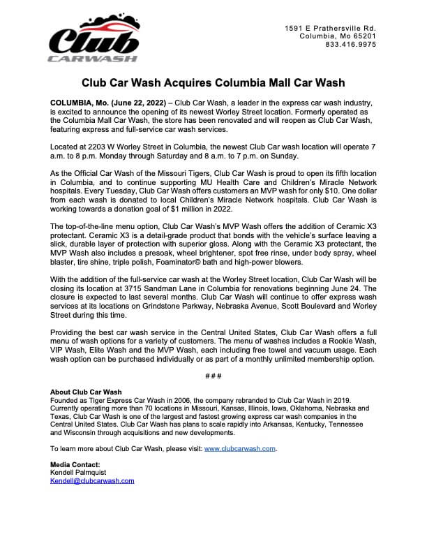 COLUMBIA, Mo. (June 22, 2022) – Club Car Wash, a leader in the express car wash industry, is excited to announce the opening of its newest Worley Street location. Formerly operated as the Columbia Mall Car Wash, the store has been renovated and will reopen as Club Car Wash, featuring express and full-service car wash services.