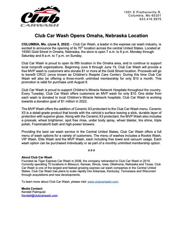 COLUMBIA, Mo. (June 9, 2022) – Club Car Wash, a leader in the express car wash industry, is excited to announce the opening of its 70th location across the central United States. Located at 19393 Gold Street in Omaha, Nebraska, the store is open 7 a.m. to 8 p.m. Monday through Saturday and 8 a.m. to 7 p.m. on Sunday.
